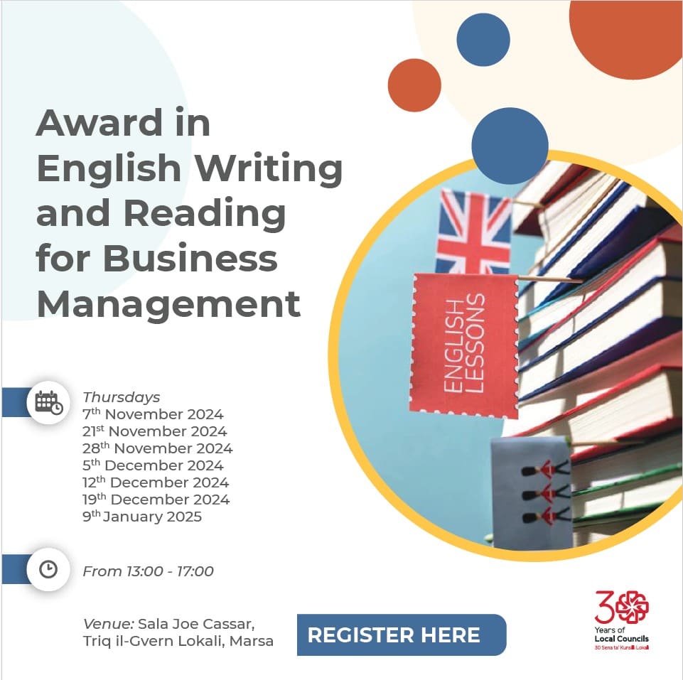 The Local Councils’ Association is organising a course entitled Award in English Writing and Reading for Business Management which will be held at Sala Joe Cassar, Local Government Street, Marsa.